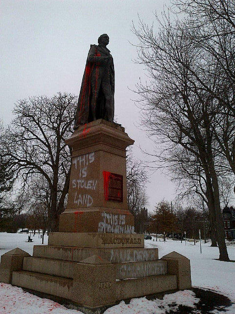 Some disgraceful Idle No More “protesters” vandalised the statue of Sir John A. Macdonald in Kingston, with “murderer” and “colonizer” epithets scrawled on it. (Police say it may be the work of someone trying to smear the movement, for the record). Because it wasn’t like he created the North West Mounted Police to ensure that white settlers weren’t massacring Aboriginals like they were in the States (most of their arrests were whites attacking Aboriginals), or that he gave them the vote in 1885 when it was limited to land-owning men otherwise (Laurier later repealed this), or that he didn’t try to come to suitable arrangements with them that allowed them to continue their traditional way of life. No, he never did anything like that for Aboriginals. Maybe the “protesters” could read a book before they decide to deface a monument like that.